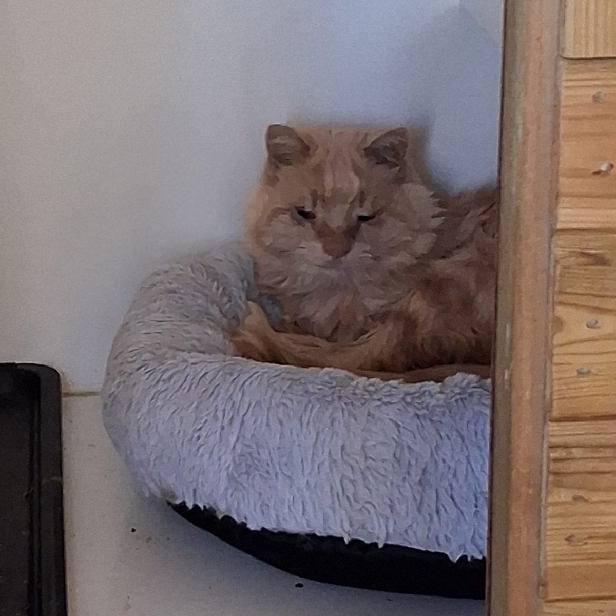 Fudge is around 12 years old. He is curious and likes to explore his surroundings. He is best suited to a home with older (or no) children and no other animals. (Note: Fudge is FIV negative).